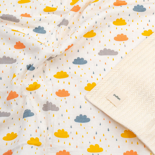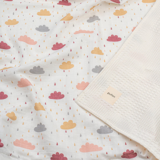 Müslin Waffle Battaniye -Bulut Desenli Beyaz 100x140 Bebek Battaniyesi