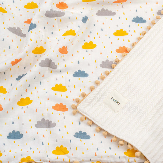 Örgü Battaniye – 90x90 Beyaz Bulut Desenli Ponponlu Müslin Battaniye
