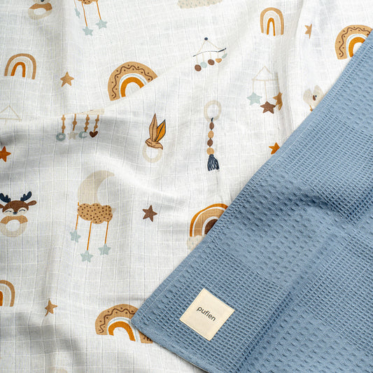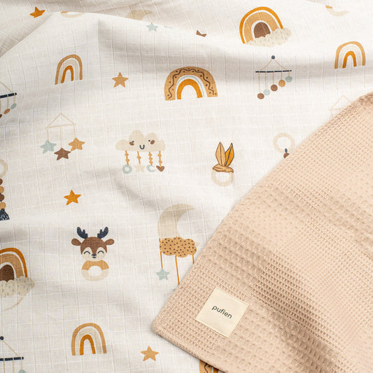 Müslin Waffle Battaniye 100x140 Gökkuşağı Geyik Desenli Bej