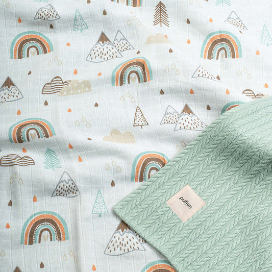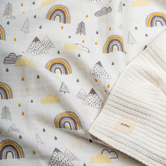 Waffle Battaniye - Dağ ve Gökkuşağı Desenli Gri