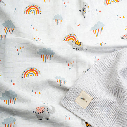 Müslin Waffle Battaniye 100x115Gökkuşağı Fil Desenli Gri