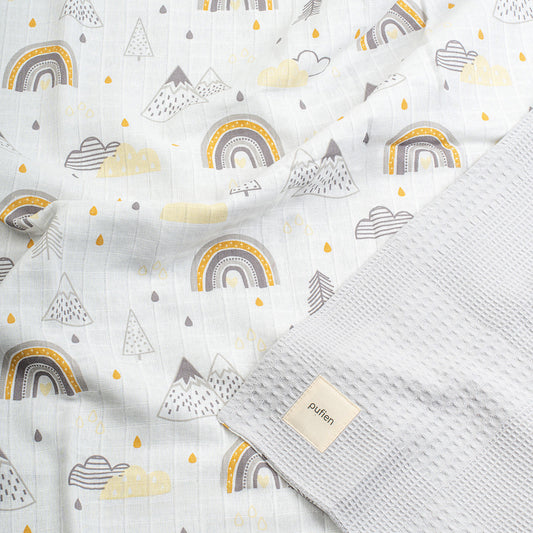 Waffle Battaniye - Dağ ve Gökkuşağı Desenli Gri