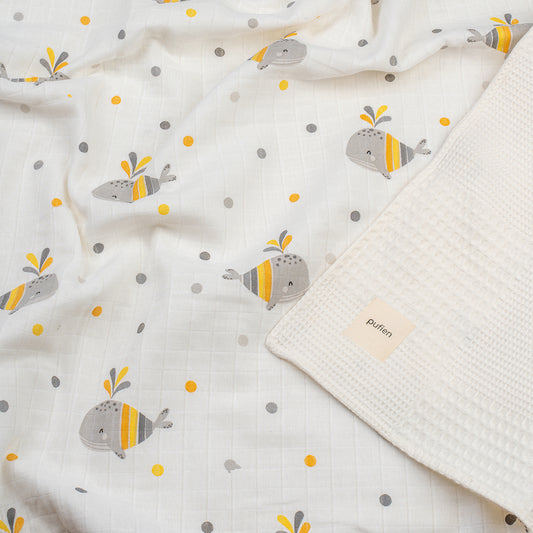 Müslin Waffle Battaniye Balina Desenli Beyaz 100x115 - Pufien