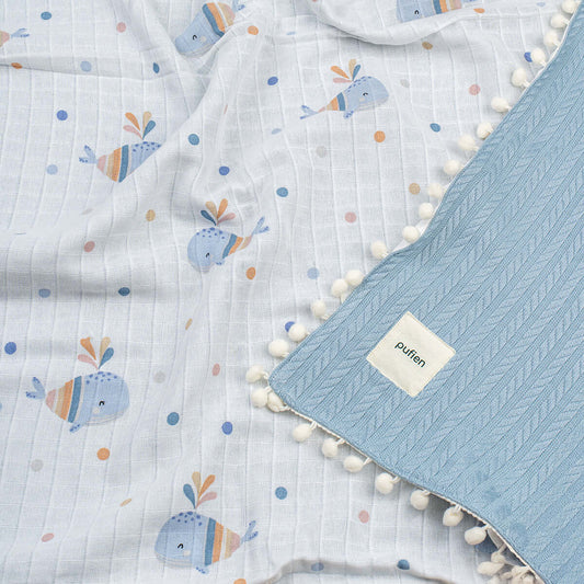 Örgü Battaniye 90x90 Mavi Balina Desenli Ponponlu Müslin Battaniye