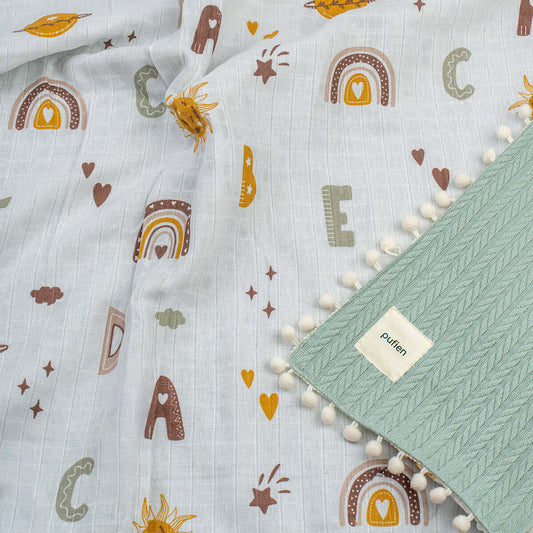 Örgü Battaniye 90x90 Yeşil Harf Desenli Ponponlu